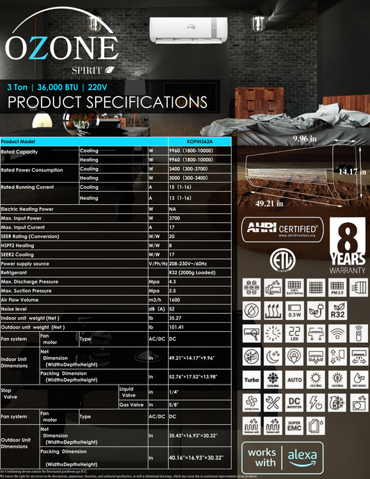 Ozone 36,000 BTU AC + Heat Kit 220v; 17 Seer, Inverter AHRI + ETL Certified