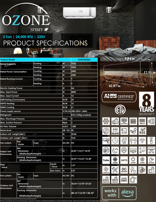 Ozone 24,000 BTU AC + Heat Kit 220v; 21 Seer, 10 HSPF2 Inverter AHRI + ETL Certified